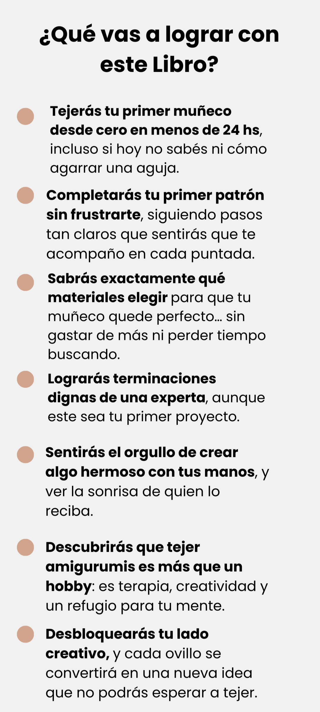 Incluye una guía completa para hacer tu primer amigurumi en 24hs, +7.000 patrones hermosos, y 6 bonos exclusivos para ayudarte a crear, organizarte y empezar a vender.